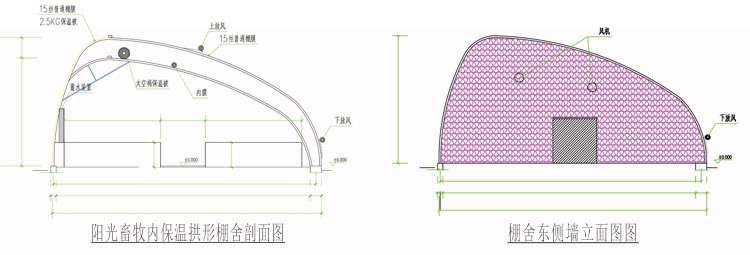 陽光畜牧內保溫拱形棚舍配套設備包括:棚舍主體、骨架系統(tǒng)、外覆蓋系統(tǒng)、內保溫系統(tǒng)、內膜系統(tǒng)、放風系統(tǒng)、新型蓄熱裝置等。